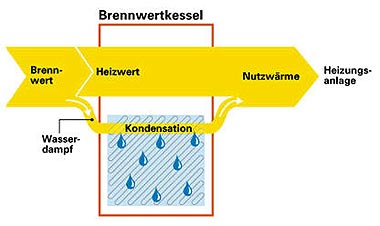 Die sogenannten Brennwertkessel nutzen bei geringen Schadstoffemissionen den Brennstoff am besten aus. Wasser ist ein wesentliches Verbrennungsprodukt von Öl oder Gas. Das Wasser entweicht bei herkömmlichen Heizkesseln in Form von Dampf mit den anderen Abgasen durch den Schornstein. Dadurch geht nutzbare Kondensationswärme verloren. Zusammenfassend: Beim Brennwertkessel wird durch Wärmetauscher den Abgasen die Wärme entzogen und dem System wieder zugeführt. Die Abgaswärme wird auf das Heizungswasser übertragen. Somit kann die eingesetzte Energie optimal ausgenutzt werden. So wird Ihr Haushaltsbudget geschont und natürlich auch die Umwelt. | ||||||||||
